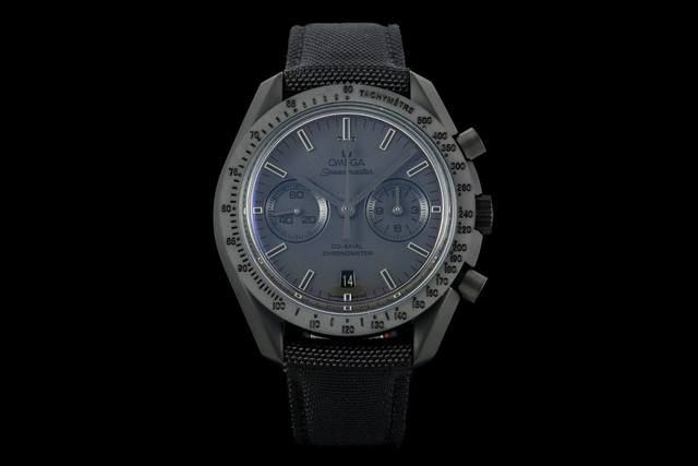 Tvs先锋之作,超霸系列 月之暗面腕表311.92.44.51.01 6 44.25毫米同轴计时表,自主研发自制9300机芯3点盘为 12小时 和 60分钟 累积计时盘,所有功能及外观均按照原版 1-1 打造, 机芯:9300双T黑摆轮,自动上链 同轴至臻天文台计时机芯,机芯镀铑表面饰有特别的阿拉伯风格日内瓦波纹 圈口:黑色陶瓷圈口+超强夜光 表盘:采用抛光黑陶瓷打造,3点和9点位置的小表盘内圈经黑化处理,搭配白金色小时刻度 表壳:黑色 表带:黑色皮带 镜面:双锅盖玻璃镜面 耐磨损 功能:日期显示 计时