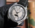 表盘 12点钟位置两个矩形视窗,分别可以显示星期和月份。日期显示位于表盘外缘,由带箭头的烤蓝指针指示。6点钟位置为月相显示,由蓝色的夜空和白金月亮组成。刻度圈配以白金材质的阿拉伯数字和棒状时标,与深邃的月相盘相映生辉。