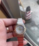 欧米茄黄金双鹰星座系列女表 24毫米表盘 天然珍珠贝母盘面 Vvs天然真钻石刻度 Vvs天然真钻石圈口 里外原镶钻 蓝宝石镜面 搭载欧米茄Cal.1376瑞士原装石英机芯 底盖八位钢印身份证号59551104清晰可见 整表全原装 整表金色部分全都是纯实心18K黄金材质永不褪色 售价61100现货放大漏16750 DDD