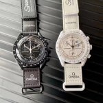 / 欧米茄X斯沃琪 全新登月之作Mission To The Moonase Bex。 这款全新腕表也配备计时功能,以及超霸系列月球表的特征 印有各大Logo标志。
