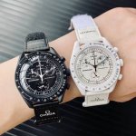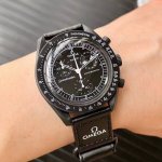 欧米茄X斯沃琪 全新登月之作Mission To The Moonase Bex。 这款全新腕表也配备计时功能,以及超霸系列月球表的特征 印有各大Logo标志。