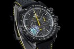 Bls新品 首次采用“全陶瓷”工艺,欧米茄 最新超霸系列 月之暗面腕表,陶瓷是一种通过高温烧制而成的无机非金属物质。这一材质可以用于制造机械性能特殊的高密度腕表部件。陶瓷是消费者在选购腕表时备受青睐的材质之一,这得益于其瞩目而多样的色彩和特殊性能,陶瓷的重量比精钢轻两倍,耐磨、高抗划性、高生化惰性、低过敏性而且无磁性。这款腕表的表壳尺寸为44.25毫米,搭载经过黑化处理的机芯,并通过激光烧蚀技术在机芯夹板呈现月球表面的真实景象,旨在致敬超霸腕表为“阿波罗8号”任务做出的杰出贡献。透过黑色阳极氧化铝的镂空表