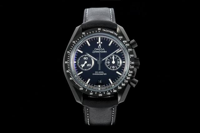 Tvs先锋之作,欧米茄 超霸系列月之暗面腕表311.92.44.51.01 4 DDD 44.25毫米同轴计时表,自主研发自制9300机芯3点盘为 12小时 和 60分钟 累积计时盘,所有功能及外观均按照原版 1-1 打造, DDD 机芯:9300双T黑摆轮,自动上链 同轴至臻天文台计时机芯,机芯镀铑表面饰有特别的阿拉伯风格日内瓦波纹 DDD 圈口:黑色陶瓷圈口+超强夜光 DDD 表盘:采用抛光黑陶瓷打造,3点和9点位置的小表盘内圈经黑化处理,搭配白金色小时刻度 DDD 表壳:黑色 DDD 表带:黑色皮带