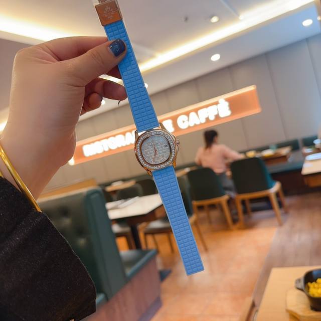 百达翡丽--手雷系列 女款简约三针, 亲民版本到货啦 石英机芯 日期显示 浮雕表盘,全质立体字块,中心大秒针,“热带”复合材质表带,Aquantaut 折叠式表