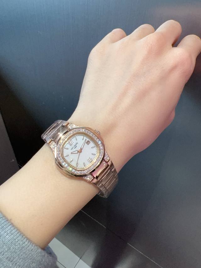 百达翡丽-patek phlllppe 鹦鹉螺Nautilus女款外径33Mm,西铁城石英机芯,自动折叠扣,采用原装进口316不锈钢材质,蓝宝石镜面,手工镶嵌施