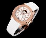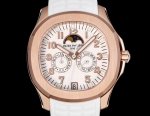 统一价: 雷王百达翡丽5261R-001最新款笑脸手雷男女通用! 百达翡丽Aquanaut系列推出首款新增便捷实用的复杂功能腕表5261R,再度绽放休闲优雅魅力! 年历腕表采用39.9毫米直径表壳,搭载新型9015进口机芯改自动上弦机芯,超薄工艺! 此款腕表比同样配备年历显示的其他百达翡丽时计格外与众不同。日期和月相视窗分别位于6时和12时位置,3时和9时位置则设有星期和月份辅助表盘。 表壳及表圈采用标志性的圆弧八角形造型,结合对比鲜明的抛光与缎纹处理。灰蓝色表盘及表带饰有Aquanaut浮雕图案,阿拉伯