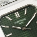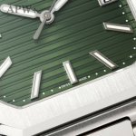 2.表盘 橄榄绿色日辉纹表盘与蓝色日辉纹表盘上的水平横纹浮雕,不仅传承了鹦鹉螺的经典波纹,更以锐利的线条切割强化了视觉的冲击力,与巴顿式指针巧妙搭配,